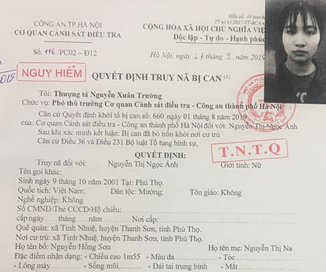 Ngày 27/9/2019, Cơ quan CSĐT Công an TP. Hà Nội đã ra Quyết định truy nã bị can đối với Ánh.