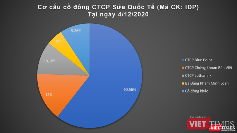 Theo danh sách cổ đông chốt ngày 4/12/2020, IDP có 4 cổ đông lớn gồm 3 tổ chức: CTCP Chứng khoán Bản Việt (15% VĐL), Lothamilk (10,18% VĐL), CTCP Blue Point (60,56% VĐL); và 1 cá nhân là bà Đặng Phạm Minh Loan (5% VĐL) - Thành viên HĐQT kiêm Tổng Giám đốc của IDP.