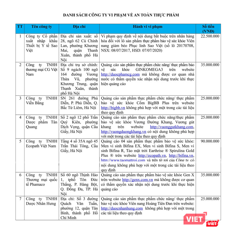 Dưới đây là danh sách các doanh nghiệp vi phạm và bị xử phạt vì vi phạm đó trong đợt này