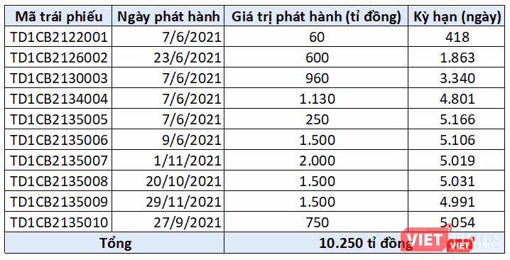 Ngoại trừ lô trái phiếu có mã TD1CB2122001 trị giá 60 tỉ đồng, kỳ hạn hơn 1 năm, các lô trái phiếu còn lại của Trung Nam Đắk Lắk 1 đều có kỳ hạn dài từ 5-14 năm.