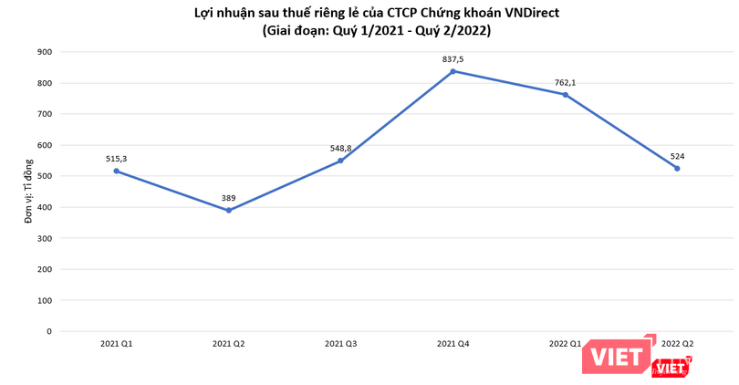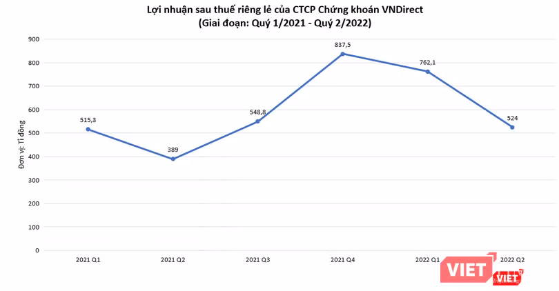CTCP Chứng khoán VNDirect (Mã CK: VND) vừa công bố kết quả kinh doanh riêng lẻ quý 2/2022 với khoản lợi nhuận sau thuế 524,2 tỉ đồng, tăng 34,6% so với cùng kỳ năm trước.