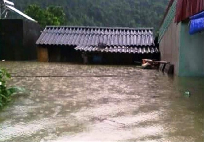 Nước ngập sâu mấp mé mái của những căn nhà cấp bốn.