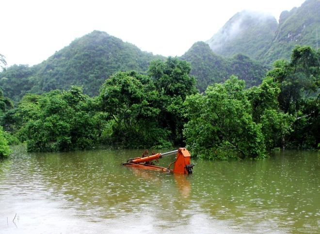 Chiếc máy xúc được nhà thầu chuyển vào thi công xây dựng đường nông thôn mới tại xã này không kịp chạy bị ngập.