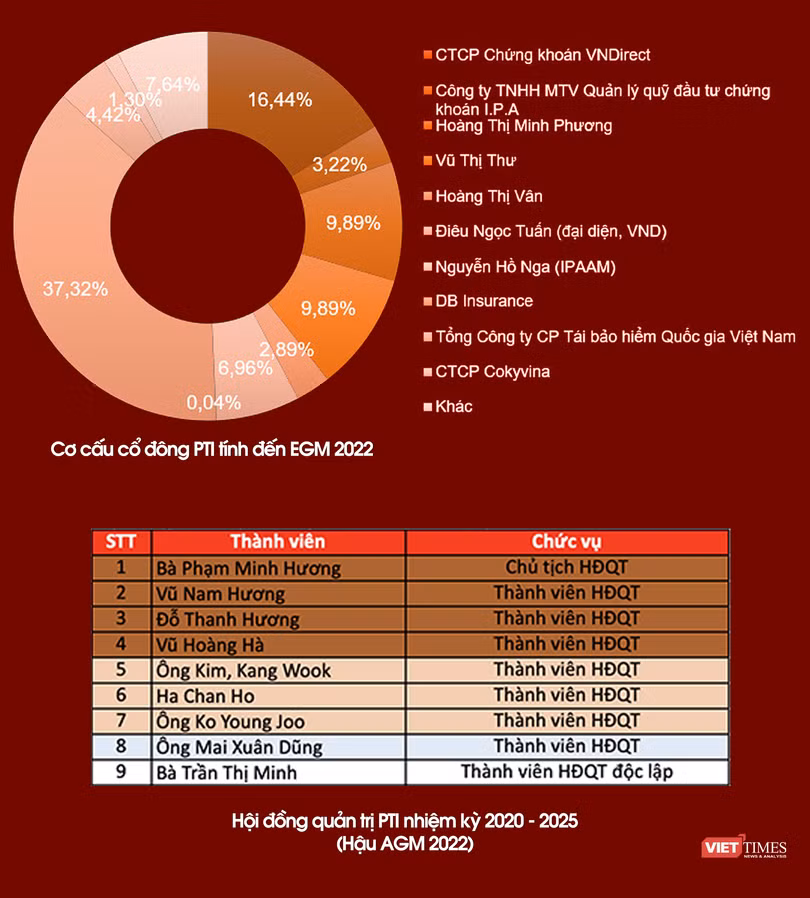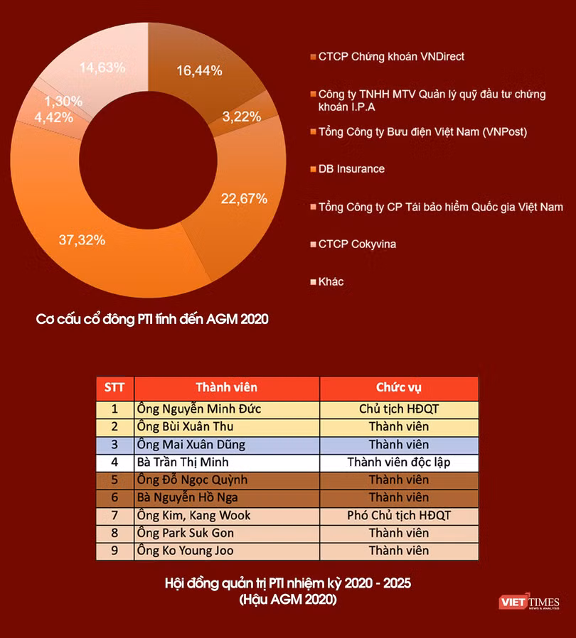 Sau khi VNPost thoái vốn, các ông Nguyễn Minh Đức và Bùi Xuân Thu đã từ nhiệm vị trí thành viên HĐQT PTI. Cùng với biến động nhân sự ở các nhóm cổ đông VND và DB Insurance, sau EGM 2022 và AGM 2022, thượng tầng của PTI mới căn bản được kiện toàn.