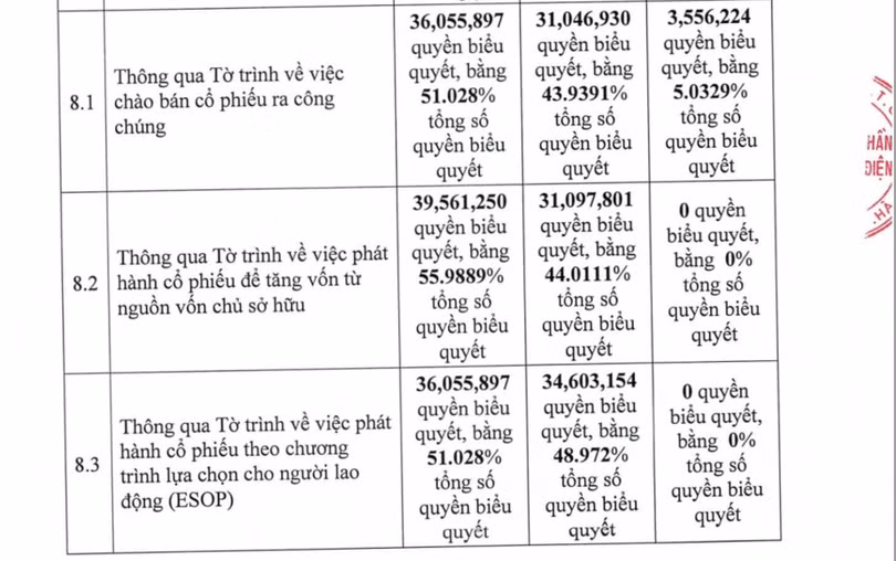 Tuy nhiên, cả 3 tờ trình tăng vốn nêu trên chỉ nhận được tỉ lệ biểu quyết tán thành từ 51 – 55,9% tổng số phiếu có quyền biểu quyết tham dự đại hội, thấp hơn tỉ lệ tối thiểu 65%, do vậy đều không được thông qua.