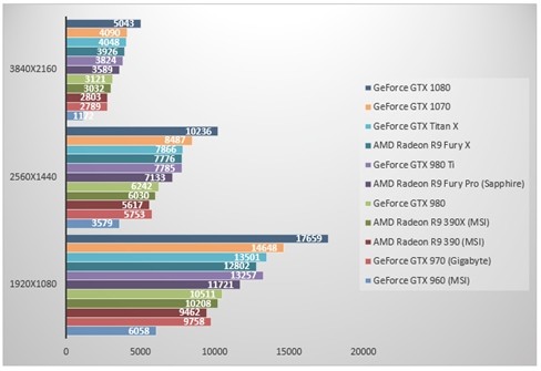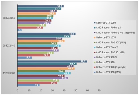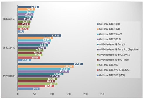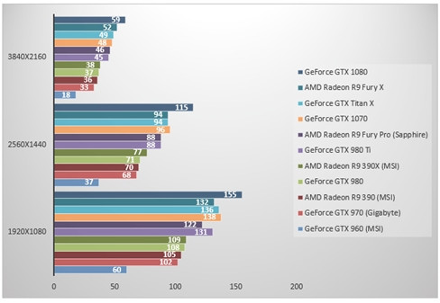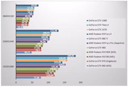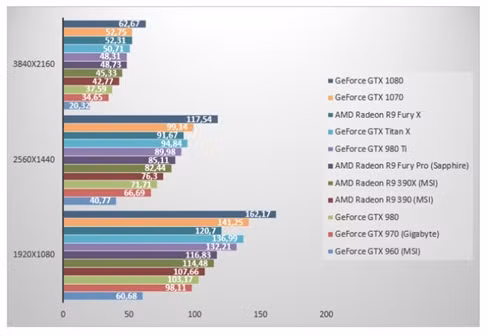 Dưới đây là kết quả so sánh GeForce GTX 1070 với các dòng card đồ họa khác ở 3 chế độ phân giải 1080p, 1440p và 2160p.