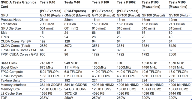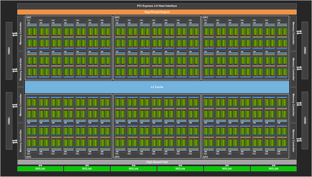 Nvidia Volta GV100 được cấu thành bởi 6 khối xử lý đồ hoạ GPC, 84 bộ đa xử lý Volta SM và 42 khối xử lý bề mặt TPC. Mỗi SM lại bao gồm 42 nhân CUDA, nâng tổng số nhân CUDA trên một đế silicon lên mức 5376. Không những thế, Nvidia còn trang bị cho GPU đời mới của mình tới 672 nhân xử lý Tensor giúp tăng khả năng hiệu năng cho các ứng dụng liên quan tới AI.