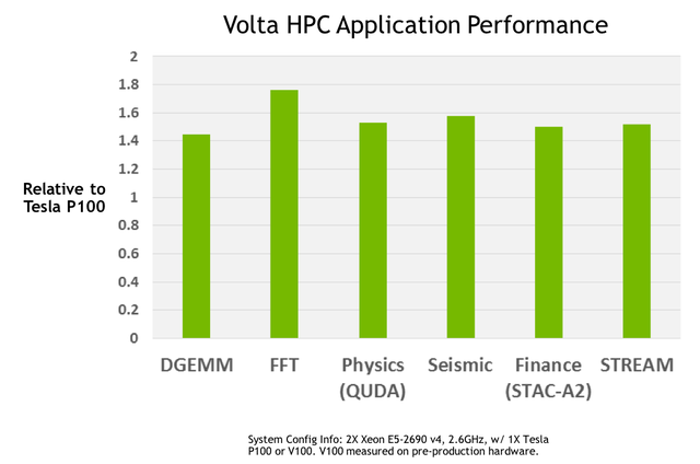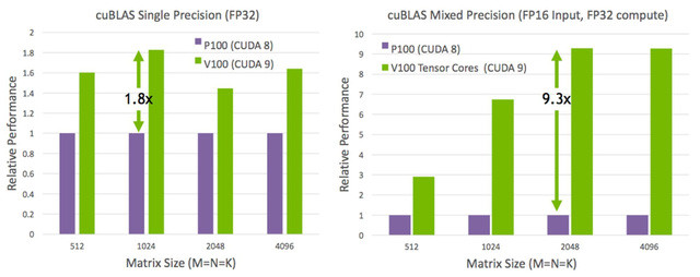 Tác vụ đa ứng dụng liên ma trận (BLAS GEMM) là thành phần cực kì quan trọng của việc phát triển mạng nơ-ron nhân tạo. Trong biểu đồ ở trên, có thể thấy vai trò của các nhân Tensor trong việc tăng hiệu năng của V100 ở tác vụ này đến 9 lần so với thế hệ trước.