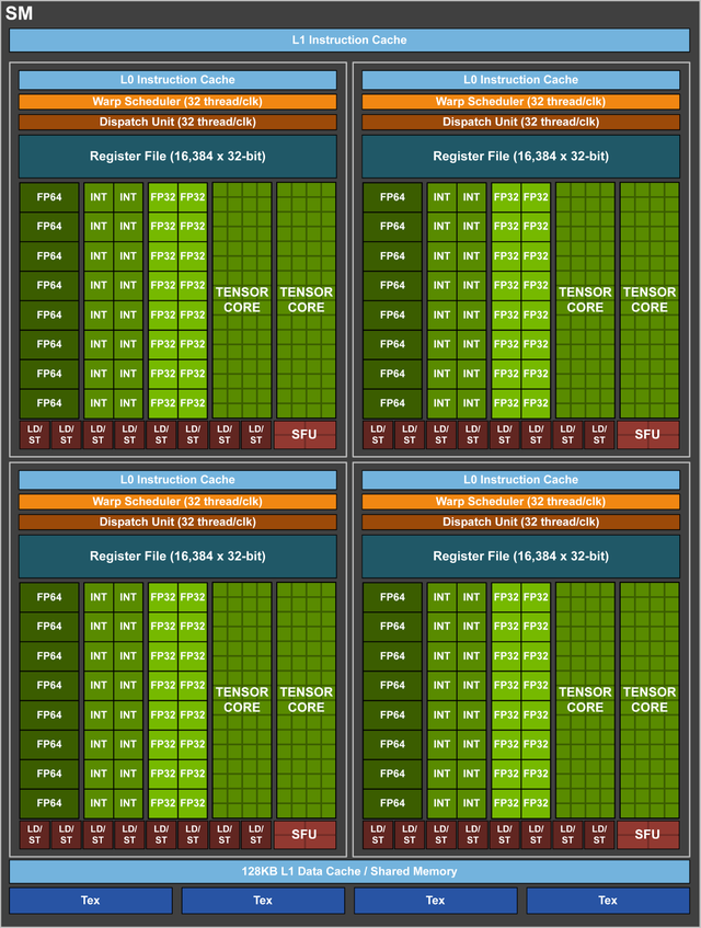Tương tự như GP100, mỗi SM của GV100 được cấu thành bởi 64 nhân FP32 và 32 nhân FP64. Tuy nhiên, Volta lại sử dụng cách phân vùng mới để tăng khả năng tận dụng SM và nâng hiệu năng chung của GPU. Ở trên GP100, số nhân FP32 và FP64 lần lượt chỉ là 32 và 16, bằng một nửa so với Volta. Bởi vậy, ngoài sức mạnh đồ hoạ vượt trội, sức mạnh tính toán cũng là một bước tiến xa của Volta so với Pascal.