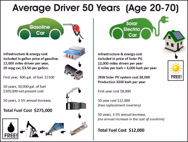 Hình ảnh so sánh chi phí sử dụng xe chạy xăng và xe chạy điện trong 50 năm