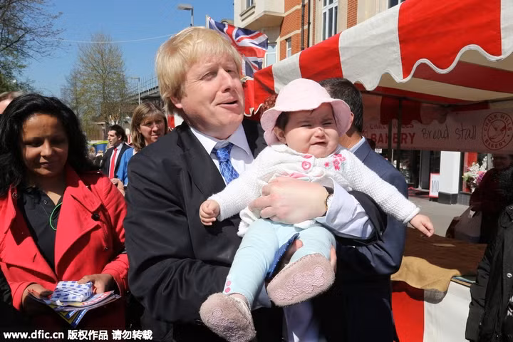 Ngày 23/4/2015, tại quận Surrey của Anh, thị trưởng London ra trận ủng hộ cuộc bầu cử của Anh. Ông Boris Johnson bế một em bé, thể hiện sự thân thiện với người dân, nhưng em bé khóc lớn vì sợ hãi.