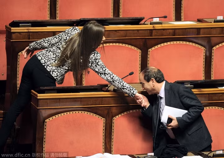 Ngày 13/1/2015, tại Rome (Italy), nữ nghị sĩ sở hữu bộ ngực khủng Maria Rosaria bị nam nghị sĩ Domenico Scilipoti hôn tay tại một hội nghị.