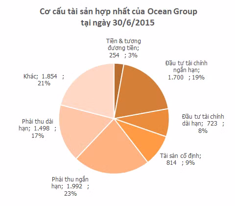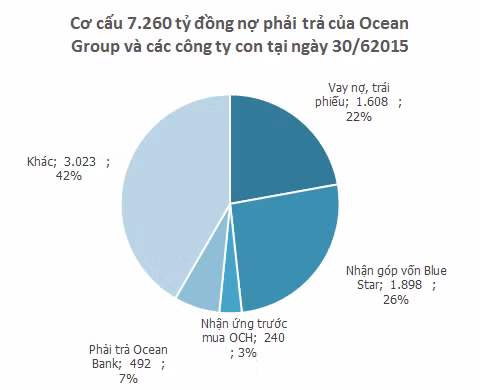 Tính đến cuối quý 2/2015, Ocean Group và các công ty con có gần 7.300 tỷ đồng nợ phải trả, tương đương 82% tổng tài sản. Tuy vậy, các khoản vay nợ ngân hàng không lớn, chỉ hơn 1.600 tỷ đồng - giảm nhẹ so với với cuối năm 2014.