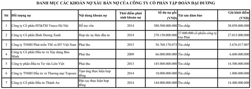 Đáng chú ý, giá khởi điểm của tất cả các khoản nợ xấu mà OGC đưa ra chỉ bằng 1/10 so với số dư nợ gốc, tương ứng giá khởi điểm cho 7 khoản nợ chỉ là 107,2 tỉ đồng.