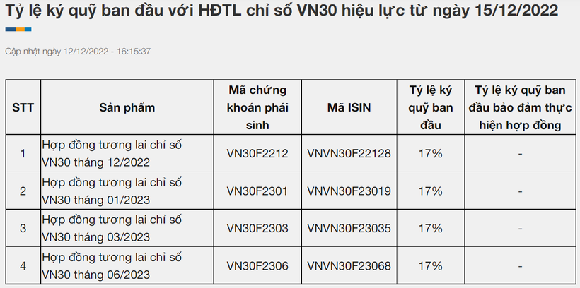 Trung tâm Lưu ký Chứng khoán Việt Nam (VSD) vừa thông báo việc điều chỉnh tỷ lệ ký quỹ ban đầu đối với hợp đồng tương lai chỉ số VN30 từ mức 13% lên 17%, áp dụng từ ngày 15/12/2022.