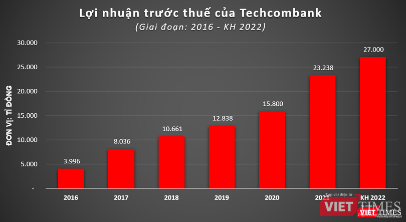 Năm 2022, Techcombank đặt mục tiêu lợi nhuận trước thuế hợp nhất đạt 27.000 tỉ đồng (tăng trưởng 16,2%); tăng trưởng dư nợ tín dụng 15%, ước đạt 446.554 tỉ đồng.