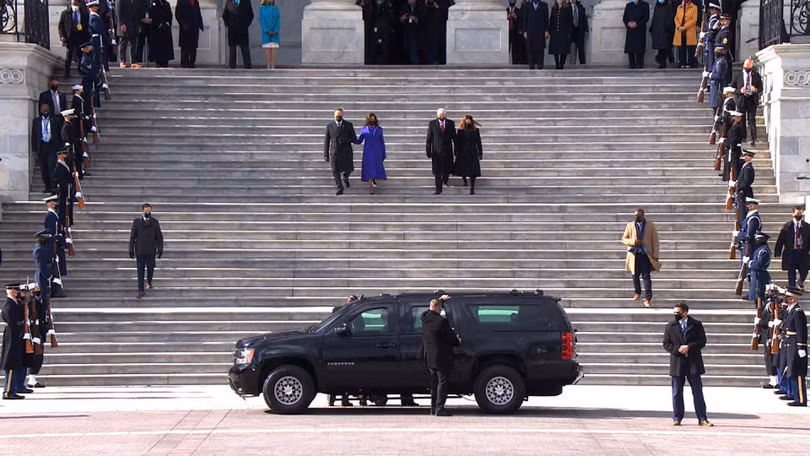 Phó Tổng thống Kamala Harris cùng phu quân Doug Emhoff đã cùng cựu Phó Tổng thống Mike Pence và phu nhân Karen bước xuống các bậc thang rời khỏi Đồi Capitol sau lễ tuyên thệ. Họ cùng nhau nói chuyện và có lúc cười vui vẻ.