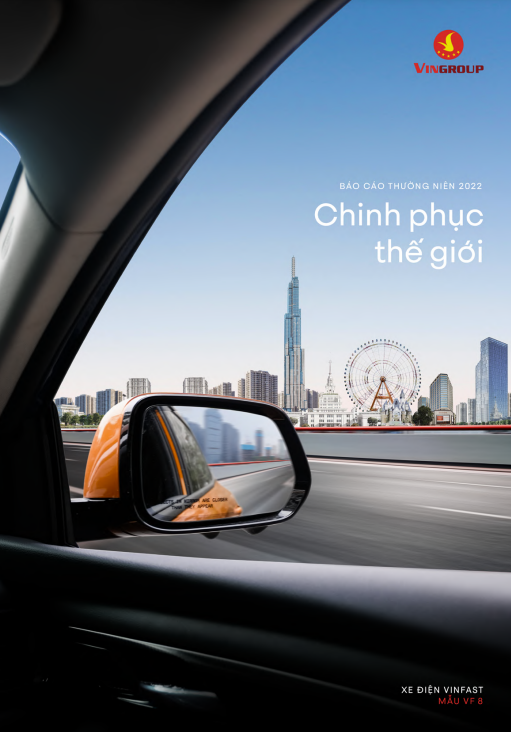 Ảnh bìa báo cáo thường niên năm 2022 của Vingroup lấy góc nhìn từ phía ghế phụ của chiếc xe điện VinFast VF 8.