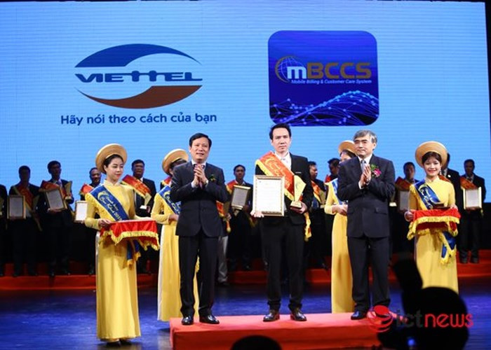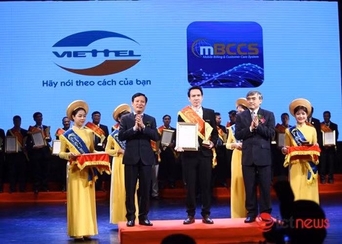 Thứ trưởng Bộ TT&TT Nguyễn Minh Hồng (bên phải) cùng Phó Bí thư Đảng ủy khối doanh nghiệp Trung ương Phạm Tấn công trao danh hiệu Sao Khuê 2018 cho đại diện Trung tâm CNTT - Tập đoàn Viettel.