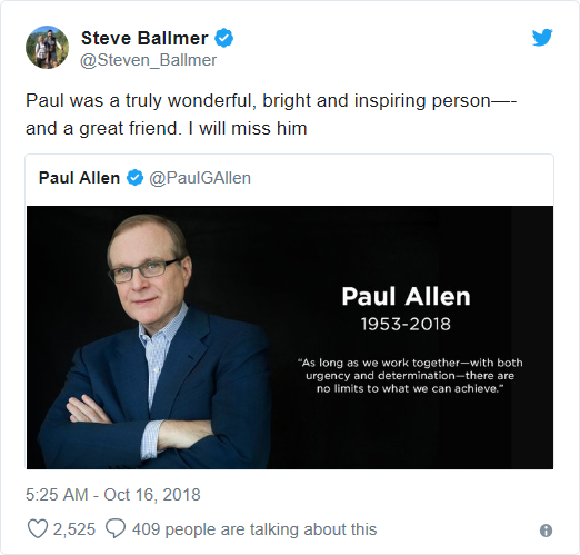 Cựu giám đốc điều hành Microsoft, Steve Ballmer gọi ông Allen là “một người thực sự tuyệt vời, lạc quan và đầy cảm hứng và một người bạn vĩ đại”.