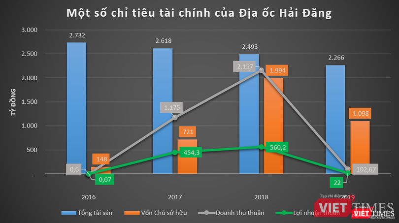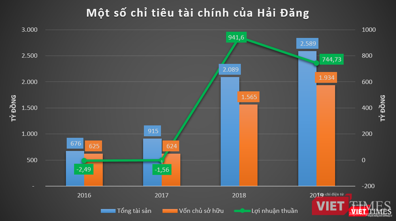 Như năm 2016 và 2017, Hải Đăng lỗ thuần lần lượt ở mức 2,49 tỷ đồng và 1,56 tỷ đồng. Tuy nhiên, năm 2018 và 2019, doanh nghiệp này bất ngờ báo lãi với lãi thuần lần lượt đạt 941,6 tỷ đồng và 744,73 tỷ đồng.
