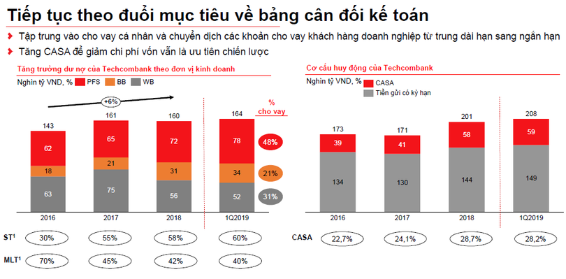Bên cạnh mục tiêu chiến lược ưu tiên là tăng CASA, Techcombank còn theo đuổi mục tiêu về một bảng cân đối kế toán linh hoạt hơn. Mặt khác, nhà băng này cũng muốn chuyển dịch các khoản cho vay khách hàng doanh nghiệp từ trung dài hạn sang ngắn hạn và tập trung vào cho vay khách hàng cá nhân. Việc duy trì đà tăng trưởng cũng là mục tiêu khó có thể bỏ qua.