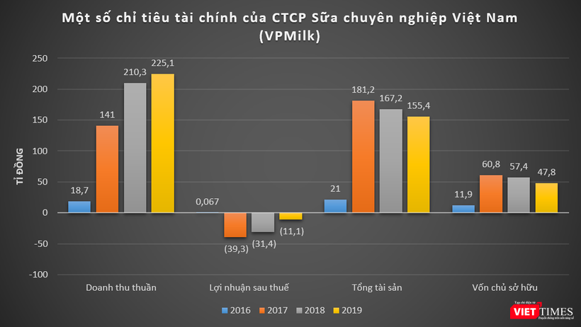 Dữ liệu của VietTimes cho thấy, trong giai đoạn 2016 - 2019, VPMilk (công ty mẹ) liên tục ghi nhận tăng trưởng về doanh thu, tuy nhiên công ty chỉ báo lãi một lần vào năm 2016 với lãi sau thuế vỏn vẹn 67 triệu đồng. Các năm sau đó, VPMilk đều báo lỗ với lỗ sau thuế luỹ kế 3 năm lên tới gần 82 tỉ đồng.