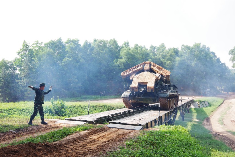 | Khẩu đội bắc cầu cơ giới TMM-3M bốn nhịp, với kỹ năng thuần thục và điêu luyện đã rút ngắn thời gian bắc cầu từ 75 phút xuống còn 37 phút bảo đảm tốt cho cuộc chạy tiếp sức “Lộ trình an toàn” của toàn đội tuyển |