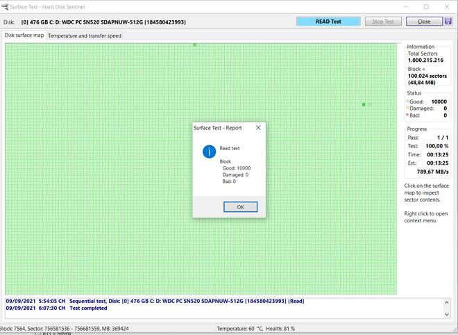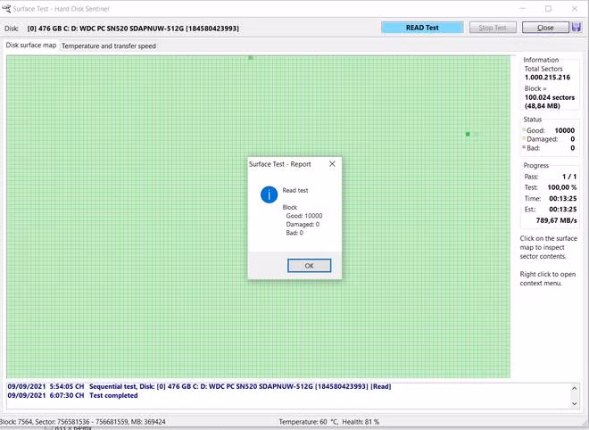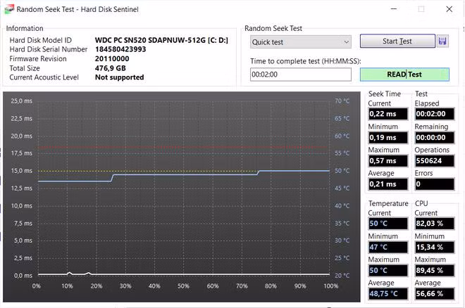 Nhấn nút "Start Test" từ hộp thoại hiện ra để bắt đầu quá trình kiểm tra ổ cứng. Sau khi quá trình kiểm tra kết thúc, nếu biểu đồ nằm dưới vạch vàng và đỏ, nghĩa là tình trạng của ổ cứng vẫn ổn định, không bị quá nhiệt sau một thời gian đọc/ghi dữ liệu liên tục.