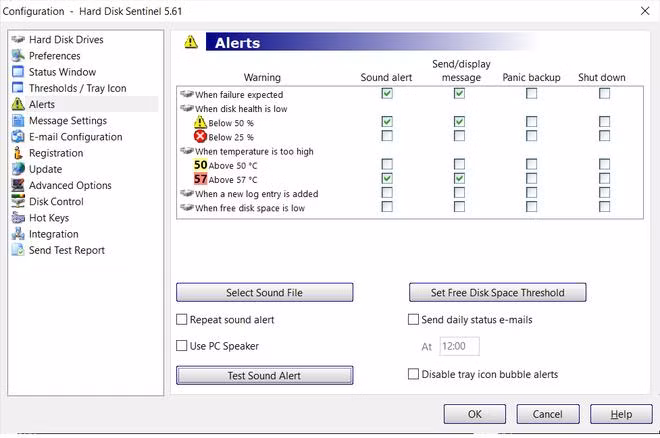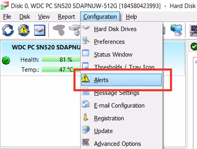 HD Sentinel còn có tính năng cảnh báo người dùng nếu phát hiện các vấn đề bất thường trên ổ cứng, để người dùng có phương án xử lý hoặc sao lưu dữ liệu kịp thời. Để kích hoạt tính năng này, từ giao diện chính của phần mềm, bạn chọn "Configuration -> Alerts" từ menu của phần mềm.