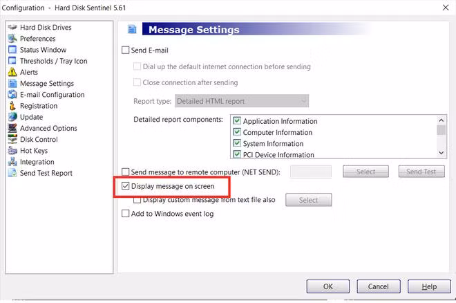 Tiếp theo, bạn chọn mục "Message Settings" từ menu bên trái, bỏ đi tùy chọn "Send Email" và đánh dấu vào tùy chọn "Display message on screen".