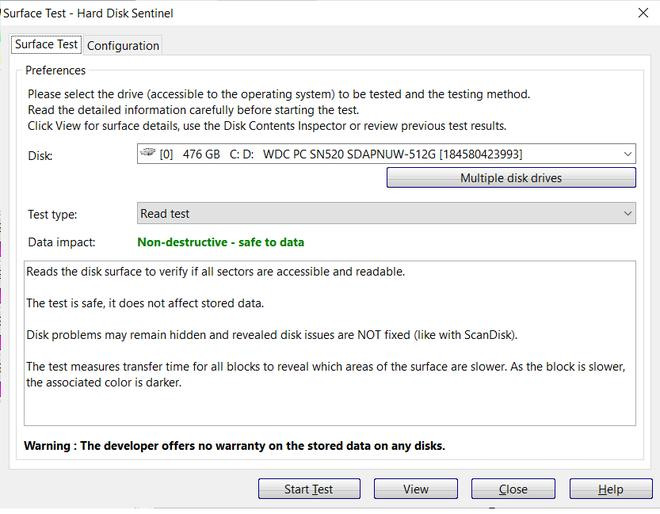 Lưu ý: khi sử dụng chức năng kiểm tra "Surface Test" , tại mục "Test Type", bạn tuyệt đối không được chọn kiểu kiểm tra "Write Test", vì kiểu kiểm tra này có thể làm mất hết dữ liệu trên ổ cứng. Bạn chỉ nên sử dụng kiểu kiểm tra "Write Test" với những ổ cứng mới mua, chưa chứa dữ liệu gì, để đảm bảo ổ cứng hoạt động ổn định. Hoặc có thể sử dụng trong trường hợp mua lại máy tính từ người khác và các dữ liệu trên ổ cứng đã được xóa sạch từ trước đó.