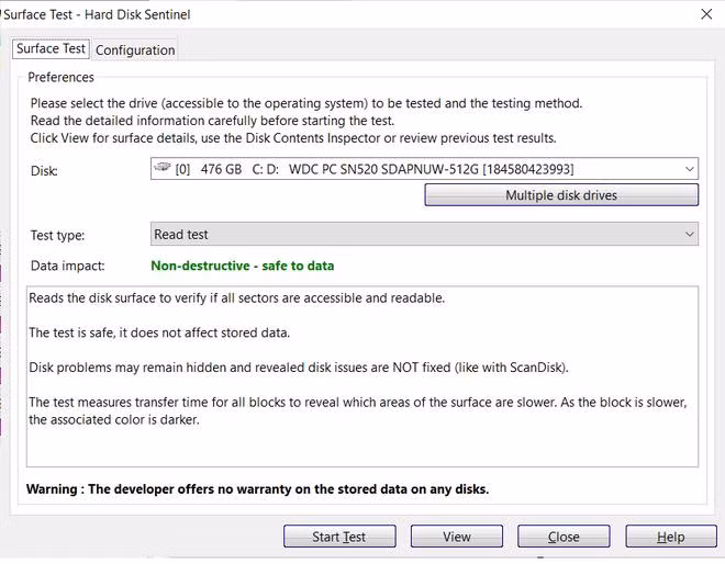 Ngoài ra, bạn có thể chọn chức năng kiểm tra "Surface Test". Đây là chức năng kiểm tra quan trọng và hữu ích nhất mà HD Sentinel trang bị cho người dùng, sẽ kiểm tra toàn bộ bề mặt của ổ cứng để đảm bảo quá trình đọc/ghi dữ liệu trên ổ đĩa đang hoạt động ổn định và không có lỗi nào có thể xảy ra.