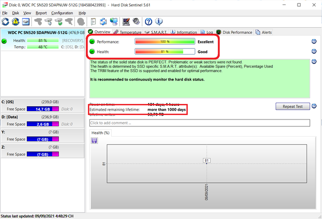 Tại đây, bạn chú ý đến thông số tại mục "Estimated remaining lifetime", là khoảng thời gian còn lại của ổ cứng mà phần mềm dự đoán. HD Sentinel sẽ dựa vào thói quen sử dụng máy tính của người dùng, như có thường xuyên đọc/ghi dữ liệu dung lượng lớn hay không, để đưa ra dự đoán về tuổi thọ của ổ cứng. Nếu thông số ở đây ở mức quá thấp, thì bạn nên cân nhắc thay mới ổ cứng.