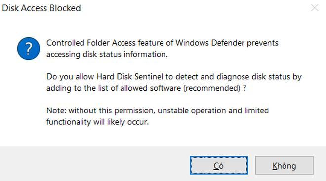 HD Sentinel sẽ phải truy cập vào các file hệ thống để kiểm tra và quản lý tình trạng của ổ cứng. Tuy nhiên, hệ điều hành Windows 10 sẽ được trang bị tính năng "Controlled Folder Access" để ngăn chặn các phần mềm lạ truy cập vào các dữ liệu hệ thống để đề phòng trường hợp máy tính bị mã độc tấn công.