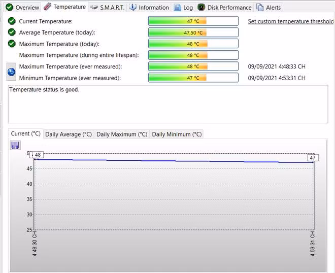 Nhấn vào tab "Temperature" ở khung bên phải giao diện phần mềm sẽ cho phép người dùng theo dõi nhiệt độ của ổ cứng trong ngày (bao gồm nhiệt độ hiện tại, mức cao nhất, thấp nhất và trung bình), hoặc chọn tab "Information" sẽ hiển thị đầy đủ thông tin về ổ cứng mà bạn đang sử dụng (như hãng sản xuất, chuẩn kết nối, tổng dung lượng, những tính năng hỗ trợ…), tab Alert để đưa ra các thông báo cho người dùng biết nếu ổ cứng gặp vấn đề hay trở ngại nào đó (lỗi đọc dữ liệu, nhiệt độ tăng cao bất thường...).