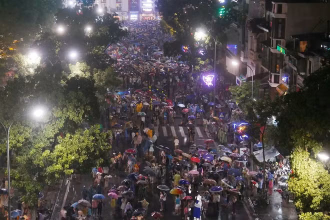 Bất chấp thời tiết không thuận lợi, hàng nghìn người dân thủ đô đội mưa, đứng quanh hồ Hoàn Kiếm, đường Đinh Tiên Hoàng, quảng trường Đông Kinh Nghĩa Thục để ngắm pháo hoa.
