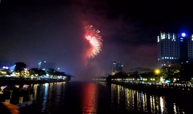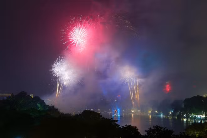 Tối 2/9,Hà Nộicó mưa, thời tiết mát mẻ, người dân kéo về quanh hồ Hoàn Kiếm chờ đón màn pháo hoa. Đúng 21h, pháo hoa đồng loạt khai hỏa ở 5 điểm làhồ Hoàn Kiếm, công viên Thống Nhất, hồ Văn Quán, sân Vận động quốc gia Mỹ Đình và Hồ Tây, rực sáng trong vòng 15 phút.