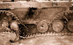 | Đạn pháo 155 mm phá hủy hoàn toàn xích và các thiết bị bên ngoài thân xe. |