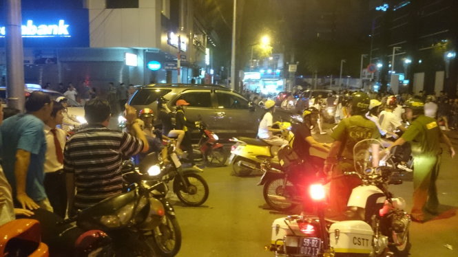 Hàng chục cảnh sát hình sự, 113, công an… vất vả khi giải tán đám đông kéo thành từng đoàn, hò hét để cổ vũ hai cô gái “giải quyết” mâu thuẫn - Ảnh: Đức Thanh.