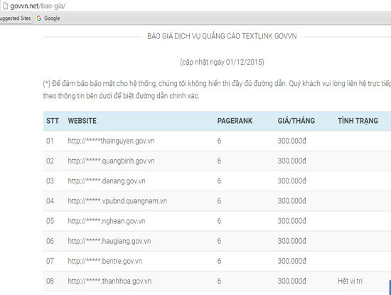 Không những thế, độc giả này còn phản ánh thông tin nhiều đơn vị ngang nhiên, công khai rao bán trên mạng các link liên kết có địa chỉ tên miền đuôi “.gov.vn” (theo Thông tư 24 ngày 18/8/2015 của Bộ TT&TT quy định về quản lý và sử dụng tài nguyên Internet, tên miền “.gov.vn” dành cho các cơ quan nhà nước ở trung ương và địa phương - PV). Chẳng hạn như, qua tìm hiểu của ICTnews từ thông tin của độc giả phản ánh, các trang govvn.net, textlinkuytin.com, protextlink.com…hiện đang công khai rao bán link trên các trang web “.gov.vn” với các mức giá từ 100.000 đồng đến 300.000 đồng/tháng cho mỗi textlink.