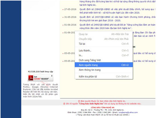 Dẫn chứng một trường hợp cụ thể, chuyên gia Bkav cho hay, ví dụ như tại trang http://congbao.nghean.gov.vn/webpages/home/home.faces, khi mở chuột phải, chọn “Xem nguồn trang”: