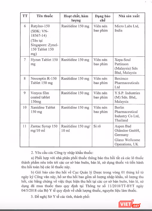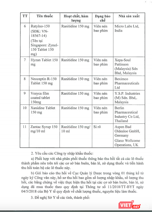 Cục Quản lý Dược cũng đề nghị Sở Y tế các tỉnh, thành phố thông báo việc thu hồi tới các cơ sở kinh doanh, sử dụng thuốc trên địa bàn, đồng thời, công bố thông tin việc thu hồi tất cả các thuốc thành phẩm nêu trên trên Trang thông tin điện tử của Sở. Từ đó, kiểm tra và giám sát các Công ty nhập khẩu thuốc trên địa bàn thực hiện việc thu hồi thuốc.