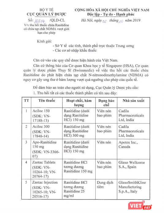 Được biết, cơ quan Khoa học y tế Singapore (HSA), Cơ quan quản lý dược phẩm Thụy Sĩ (Swissmedic) đã có thông báo về việc thu hồi các thuốc chứa Ranitidine do phát hiện các thuốc này chứa tạp chất N-nitrosodimethylamine (NDMA) có nguy cơ gây ung thư ở hàm lượng vượt quá ngưỡng cho phép của quốc tế.