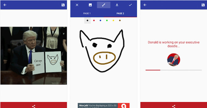 Trong những ngày vừa qua, ứng dụng chế ảnh Donald Draws Executive Doodle đang tạo nên một cơn sốt với hàng triệu lượt tải về và sử dụng. Nó cho phép người dùng tạo ra một "sắc lệnh hành pháp" riêng và đặt nó vào bàn tay của Tổng thống Mỹ. Kết quả là một ảnh động ngắn để chia sẻ trên các diễn đàn và mạng xã hội với mục đích hài hước. Nhà phát triển ứng dụng này là 321 Fetch Avenue, có trụ sở tại Mountain View, California, Mỹ (Thung lũng Silicon).