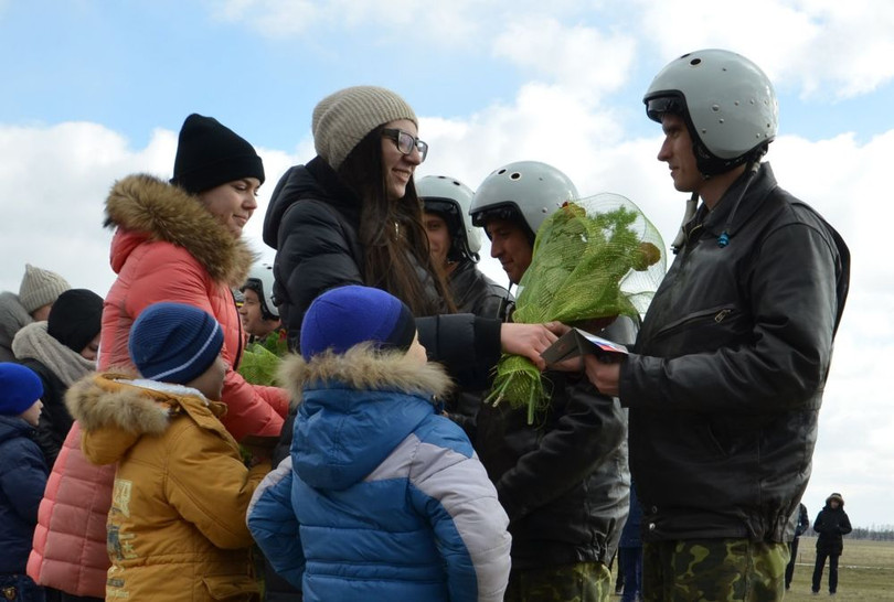 Các phi công gặp vợ con, người thân và bạn bè của họ tại sân bay. Hàng trăm người, trẻ em và thanh thiếu niên, với cờ, hoa tươi và bóng bay đón các phi công tại sân bay.