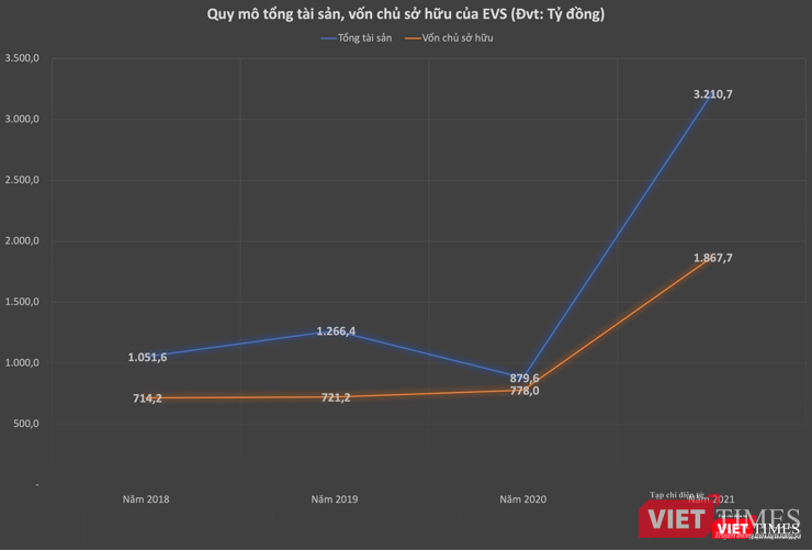 Tính đến ngày 31/03/2022, tổng tài sản của EVS đã đạt 3.304,44 tỉ đồng, bằng 2.9 lần giá trị tổng tài sản so với thời điểm cuối quý 1/2021, quy mô tài sản đạt 1.141,87 tỉ đồng. Trong đó, quy mô FVTPL (giá trị danh mục tự doanh) tăng 120%, đạt gần 928 tỉ đồng vào quý I. Vào thời điểm kết thúc tháng 3, công ty nắm giữ lượng tiền mặt gấp 7 lần so với cùng kỳ, đạt 362 tỉ đồng.