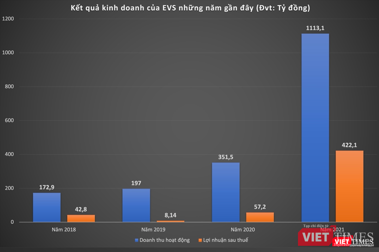 Sau ba tháng đầu năm nay, EVS ghi nhận doanh thu hoạt động lên tới hơn 307 tỉ đồng, gấp 2,4 lần so với cùng kỳ năm trước. Trong đó, EVS ghi nhận lãi hơn 115 tỉ đồng từ lãi bán các tài sản tài chính, so với mức chỉ gần 3 tỷ cùng kỳ năm 2021).