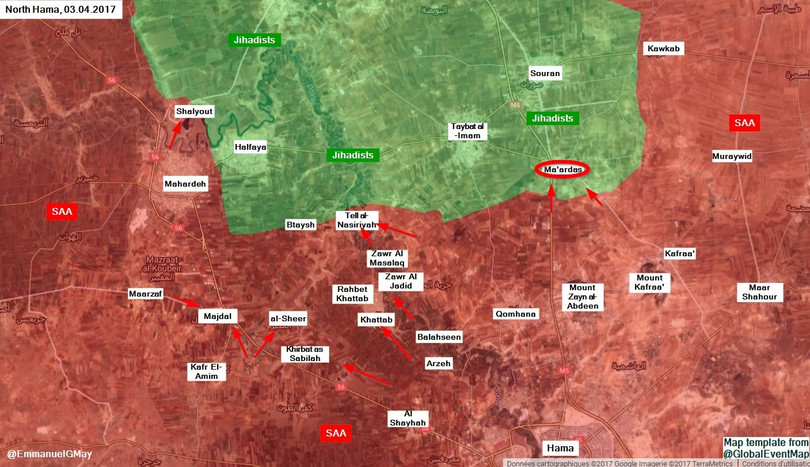 Lực lượng khủng bố đăng tải một video, quay lại cảnh các tay súng khủng bố, sử dụng hỏa lực pháo binh hạng nặng bắn phá chiến tuyến phòng ngự của quân đội Syria trong thị trấn Maardes, sau đó đột phá thị trấn bằng lực lượng chiến binh, sử dụng tăng thiết giáp làm lực lượng đột phá chủ yếu đánh chiếm thị trấn.