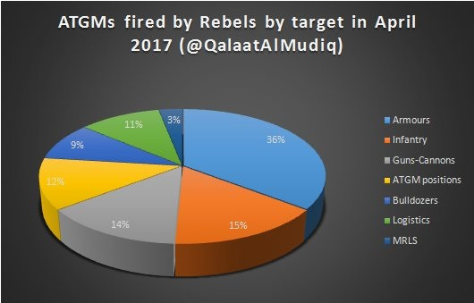 Trong tháng 4.2017, lực lượng chiến binh thánh chiến ở Idlib - Hama sử dụng đến 65 tên lửa chống tăng TOW của Mỹ tấn công quân đội Syria, bằng cả mùa đông năm 2016, chủ yếu tấn công xe tăng, thiết giáp (chiếm 36%) (bộ binh 15%) số còn lại là các phương tiện chiến tranh khác